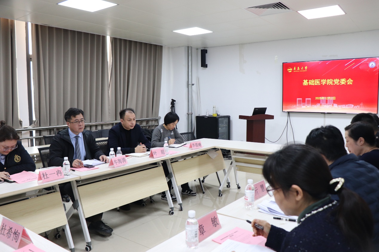 在专题宣讲环节,牛海涛紧扣二十届四中全会精神核心要义,结合高等教育发展规律与医学教育特色,锚定国家战略、立足青大实际,就推动基础医学事业高质量发展展开深入解读。他指出,全会提出的“一体推进教育科技人才发展”“加快高水平科技自立自强”等重要部署,与高校办学治校核心任务高度契合,今年学校在科研创新领域成果丰硕,医工交叉领域实现新突破,正是全会精神在校园落地生根的生动实践。牛海涛强调,基础学院作为医学教育和科研创新的“源头阵地”,要紧扣学校“医工交叉”办学特色,依托6个ESI全球排名前1%学科的坚实优势,在重大疾病机制研究、高端医疗技术攻关等关键领域持续发力。一是要将全会精神切实转化为“十五五”规划的具体举措,聚焦学科提质、人才强院核心任务;二是要深化有组织科研,依托学校学科交叉资源,在特种医学、智能医疗等特色领域打造差异化竞争优势;三是要强化校地校企协同,推动科研成果向临床应用、产业转化延伸,为健康山东建设提供坚实的医学支撑。