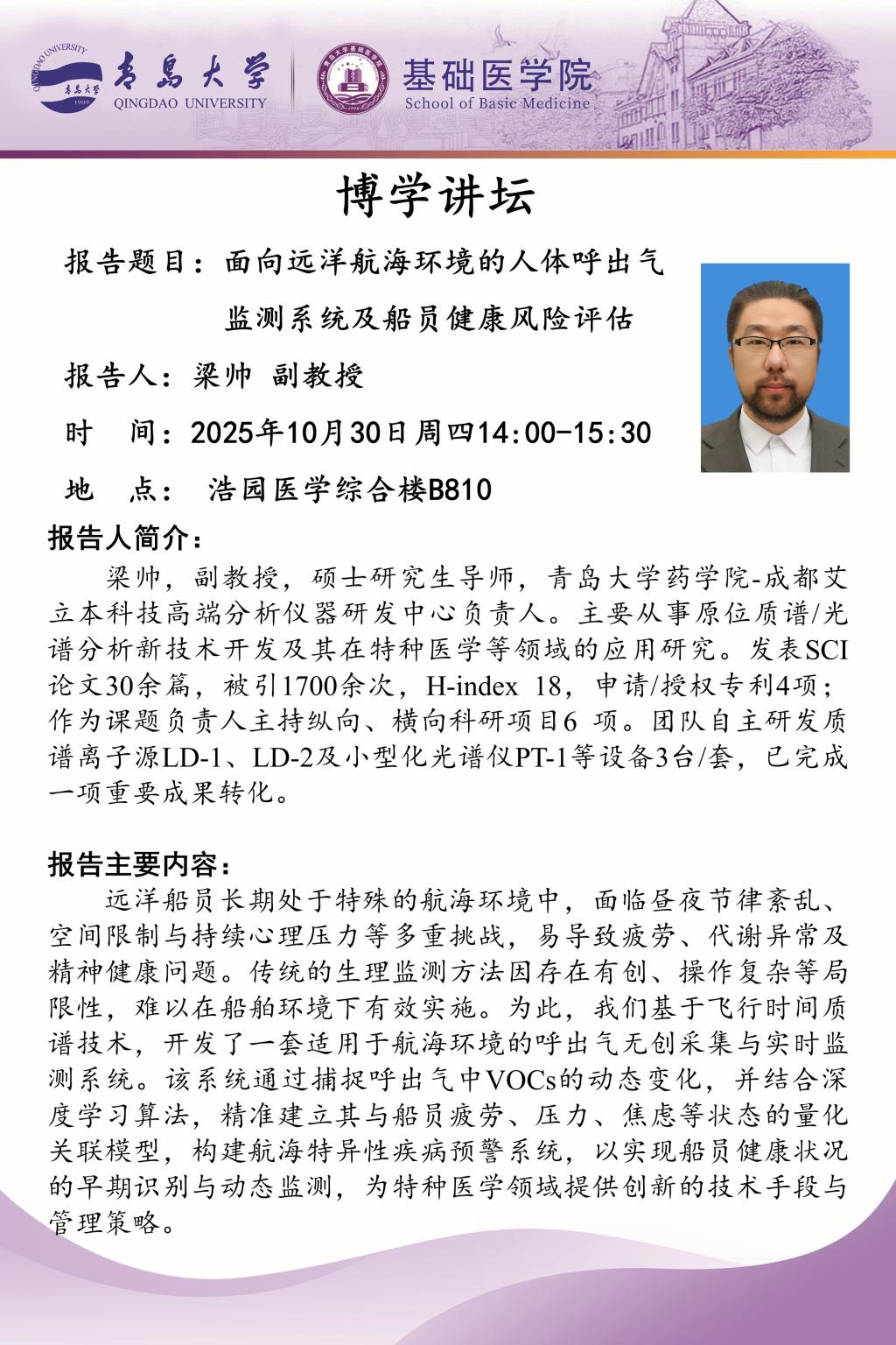 本场讲座将采取线下报告的形式,地点在浩园医学综合大楼B座810会议室。