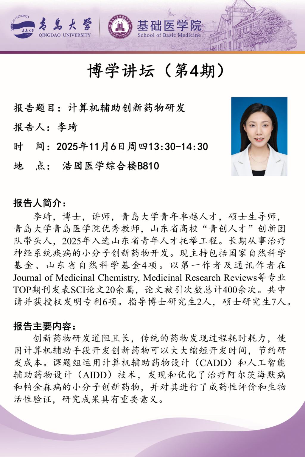 李琦介绍部分研究成果已经实现转化,为神经退行性疾病治疗提供了全新的候选药物,也为后续创新药物研发提供了可借鉴的技术范式,推动计算机辅助药物设计领域的发展。现场师生纷纷表示,报告内容兼具学术深度与实践价值,为相关领域研究提供了重要参考。